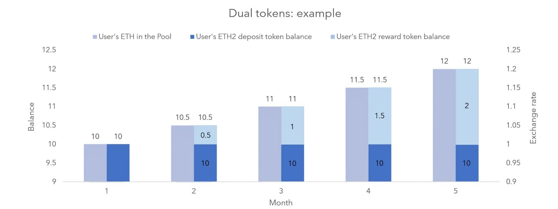盡管使用不同的機制來反映收益的累積,但是單個代幣設計有一個共同點:將存款和獎勵捆綁在同一個代幣中。這意味著,無論何時在市場上買賣代幣或從存入者手中得到代幣,您都將同時接收/出售押金和過去累積到池中的任何獎勵。雙代幣設計相反,雙代幣結構基于兩個重新平衡代幣的概念,這兩個代幣分別反映了存款和獎勵。相比之下,雙重代幣結構是基于分別反映存款和回報的兩個再平衡代幣的概念。以stakewise的代幣舉例,存款和回報代幣分別是stETH和reETH。持有雙代幣設計的質押代幣時,代表質押以太坊的代幣stETH不會增長,而以1:1的比例積累獎勵的rwETH(獎勵ETH)代幣將反映在質押池中收益份額的增長。總之,這些代幣的總和構成了整體收益狀態,并且可以在以太坊網絡之間自由轉移,并且在智能合約中以與單個代幣相同的方式使用。只要持有質押代幣,它就會積累獎勵代幣。隨著獎勵池的增長,代表存款的以太坊代幣stETH的余額保持不變,但持有地址會獲得獎勵代幣reETH。