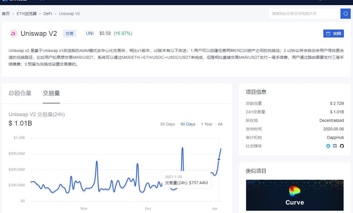 本周內以太坊的交易量在周末出現大幅上升,單日鏈上交易量達到577萬ETH,而且這些交易量可能不僅來自于普通錢包與交易所之間的轉賬。隨著以太坊上DeFi協議的發展,以Uniswap為首的去中心化交易所Dex以及各類借貸協議已經成為一股不可忽視的力量: