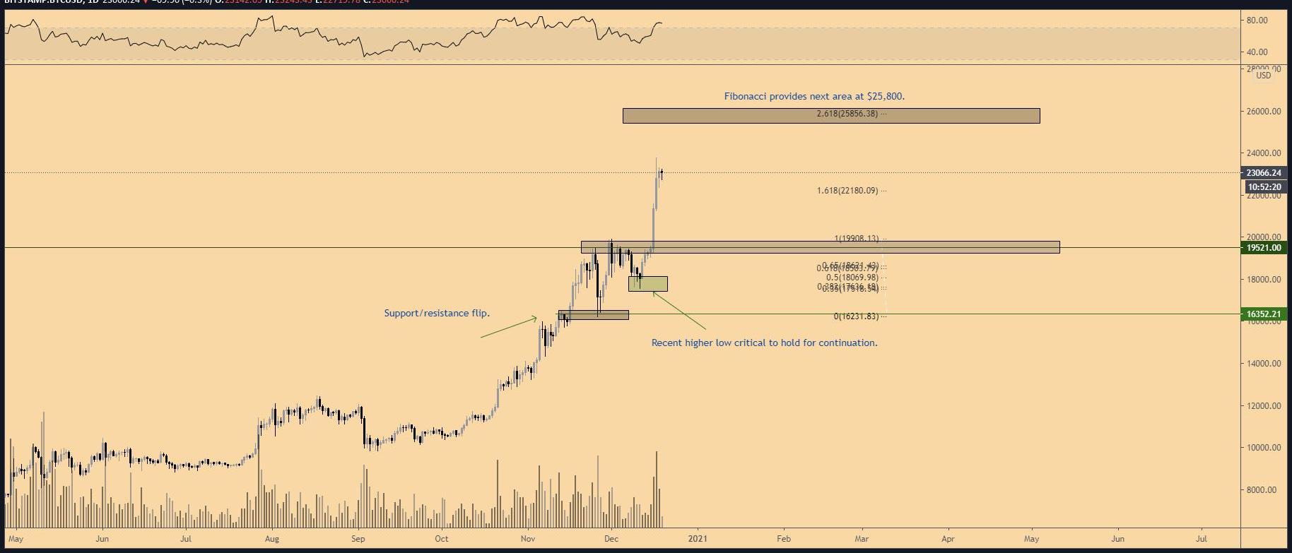 XRP/HKD-0.52%編者按:本文來自Cointelegraph中文,作者:MICHA?LVANDEPOPPE,Odaily星球日報經授權轉載。比特幣的價格在前幾個月出現了大幅上漲,從1萬美元迅速上漲到近期歷史最高水平24000美元左右。在短短幾個月的時間里上漲超過135%。討論比特幣的價格在達到24000美元之后的走勢是一種猜測。不過,本輪上漲必須維持在一定水平才能繼續。此外,一些指標有助于分析圖表和預測價格發現的潛在興趣領域。如果守住24000美元,則可能繼續上漲到25800美元