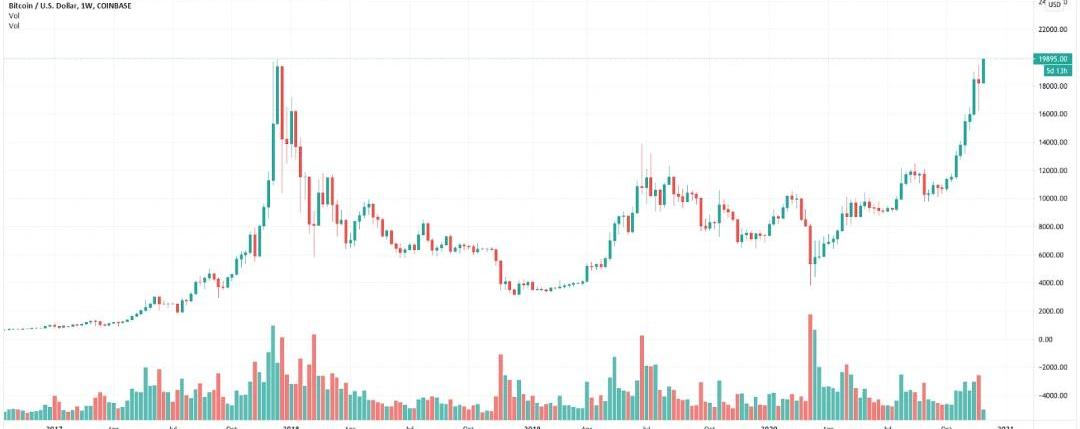 XRP/HKD-0.31%編者按:本文來自萌眼財經,Odaily星球日報經授權轉載。加密貨幣領域一直沉迷于2017年冬季的牛市,但隨著比特幣突破其歷史最高價19655美元,加密世界可能正在向未知領域進發。很多因素的結合為比特幣超越2017年高點創造了合適的環境。2020年春季期間,COVID-19導致市場崩潰,BTC瞬間跌至5000美元左右,然后強勁復蘇的前景推動了新的投資。而今年晚些時候,有消息稱PayPal將支持加密貨幣的買賣,以及美國總統大選帶來的不確定性,也進一步推動了比特幣的走勢。