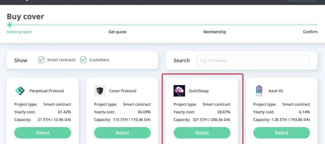 NexusMutral的設計比較有趣,它的設計初衷是要復原來自2000多年前東方文明的保險智慧:相傳在2000多年前的中國,商人運貨經常需要走水路,但是那樣很容易導致翻船,他的貨物就會全部損失。于是,人們想到一個辦法,就是許多商人團結在一起,一起把貨物運過去,假如10個商人一起運貨,那每個人的船上都帶有10個人貨物的1/10的量,這樣要是翻了一艘船,也只是所有人損失了自己貨物的1/10,這顯然對所有人是最優的方式。這就是通過集體的力量分散風險的最古老的方式。不過因為這種方式能連接的人太有限,這種保險模式很難規模化,這才有了西方的中心化保險體系。但是現在這種體系暴露了一些問題:信息不對稱、說服一個人投保成本高、監管壓力大、保險理賠時投保人只能得到一部分、業務成本高等等。但是一些去中心化的擁躉們發現,區塊鏈網絡的去中心化思想反而能讓保險回歸到2000年前中國的那種形態——也就是說,打破中心化的保險格局,讓所有的保險參與者都通過stake的方式承擔風險,并賺取收益。通過經濟模型的設計,激勵人們更愿意參與到協議里來,消除了信息不對稱,并大幅度的降低了監管壓力。換句話說,就是DeFi里的共同基金式的保險。如同其創始人所言:Itallowsthecooperativeethostoberegainedwhilepreservingthebenefitsofdiversification.NexusMutual系統經濟模式運行的核心是NXM代幣,這種代幣不被允許上交易所,這樣就免去了被操縱價格的風險。一個用戶可以成為投保人,也可以成為承保人。簡單而言,如下圖一個人可以通過進入其保單的頁面,選擇一個保單,然后設定要保的價值,以及讓協議給你保多久,然后就會生產一個保單的報價,用戶只需通過metamask就可以用ETH、DAI或者NXM為保單付款,這樣如果他在Sushi的合約上有資產,一旦Sushi發生漏洞導致你的財產損失,NexusMutual就會為你賠付盡可能最多的數量。