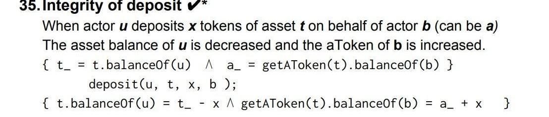 Aave的代碼庫經過了形式化驗證,區塊鏈領域的一個趨勢是,人們會認為安全特性是圣杯。用戶可能會嘗試根據這些特性的存在與否,對各種合約的安全性進行排序。我們認為這是危險的,它會導致錯誤的安全感。Aave形式化驗證報告列出了LendingPool視圖函數以及池操作的屬性。例如,已驗證的屬性之一是: