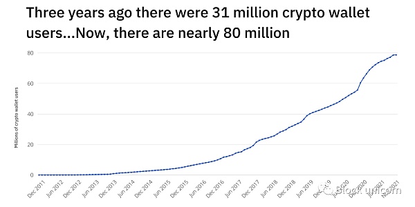 我們先來看消費者。三年前,估計有3100 萬加密錢包用戶;今天,有近8000萬。?
