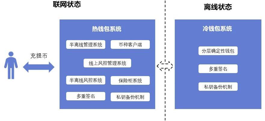 我們知道,掌控加密數字貨幣其實就是儲存和管理這筆資產的私鑰。在儲存與管理私鑰方面,主要有兩大目標:一是安全性,即保證沒有其他人可以動用我們的加密資產;二是便捷性,即我們可以方便快捷、隨時隨地動用資產。然而,安全性與便捷性之間具有天然的矛盾:為了安全性,必須犧牲一定程度的便捷性;滿足了便捷性,安全性會打折扣。交易所在加密資產的管理上,同樣也面臨著上述矛盾。目前對于加密資產的存儲,主要有熱存儲和冷存儲兩種形式。其中,熱存儲即采用聯網的錢包進行存儲,而冷存儲則是將資產放在處于離線狀態的錢包中。這與銀行對現金類資產的保管有相似之處:熱錢包就像銀行柜臺前的鈔箱,可以高頻處理用戶的充幣、提幣需求,但安全程度低一些;冷錢包就像銀行的地下金庫,與外部隔絕,安全程度很高,但在充幣和提幣時十分不方便。同商業銀行一樣,為了兼顧便捷性和安全性,OKEx在資產的管理方案上,將5%的資產放置在熱錢包中,95%的資產置于冷錢包。由熱錢包滿足用戶的日常充提幣需求,而存放在絕大多數資產的冷錢包,則可充分保障用戶資產的安全。當熱錢包中的資產不足時,冷錢包短時間聯網上線,轉入一部分資產到熱錢包;當熱錢包中的資產過多時,熱錢包將資產打入冷錢包的地址即可,此過程冷錢包可不用上線。