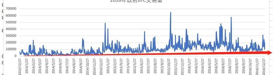 圖2相比上面兩個圖,第一個圖就不太明顯了,但第二個圖相對比較明顯。雖然這個圖上的點并沒有處于一條直線附近,但是我們還是可以看見散點分布在一個角的范圍內。這個角的趨勢是向右上方發展的。這個正向的關聯,由于沒有具體的相關分析,小蜜蜂只能稱之為正向的關聯。而這種關聯性其中存在著模棱兩可的因果關系:到底是因為BTC價格上漲、引起交易量上漲?還是因為交易量上漲,反應著市場的繁榮,從而推動BTC價格上漲呢?這是一個先有雞還是先有蛋的問題。也許不需要太糾結這個問題。畢竟BTC的價格上漲和市場繁榮是互相促進的。牛市