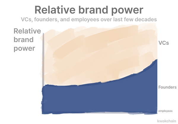 然而,在如今的生態系統中,公司擁有的敘事杠桿敘事杠桿越來越多,甚至超過了風險投資機構。頂級公司與其創始人有時比他們的資方更知名。舉例來說,支付服務提供商Stripe的創始人Patrick Collison在吸引投資、客戶和員工這些方面的能力比任何一家風險投資機構都強得多。越來越多的創業者開始擁有比風投更強的品牌影響力,這既是由于創業者的地位越來越重要,也是由于風險投資在除了幫助企業提升品牌網絡效應之外停滯不前。