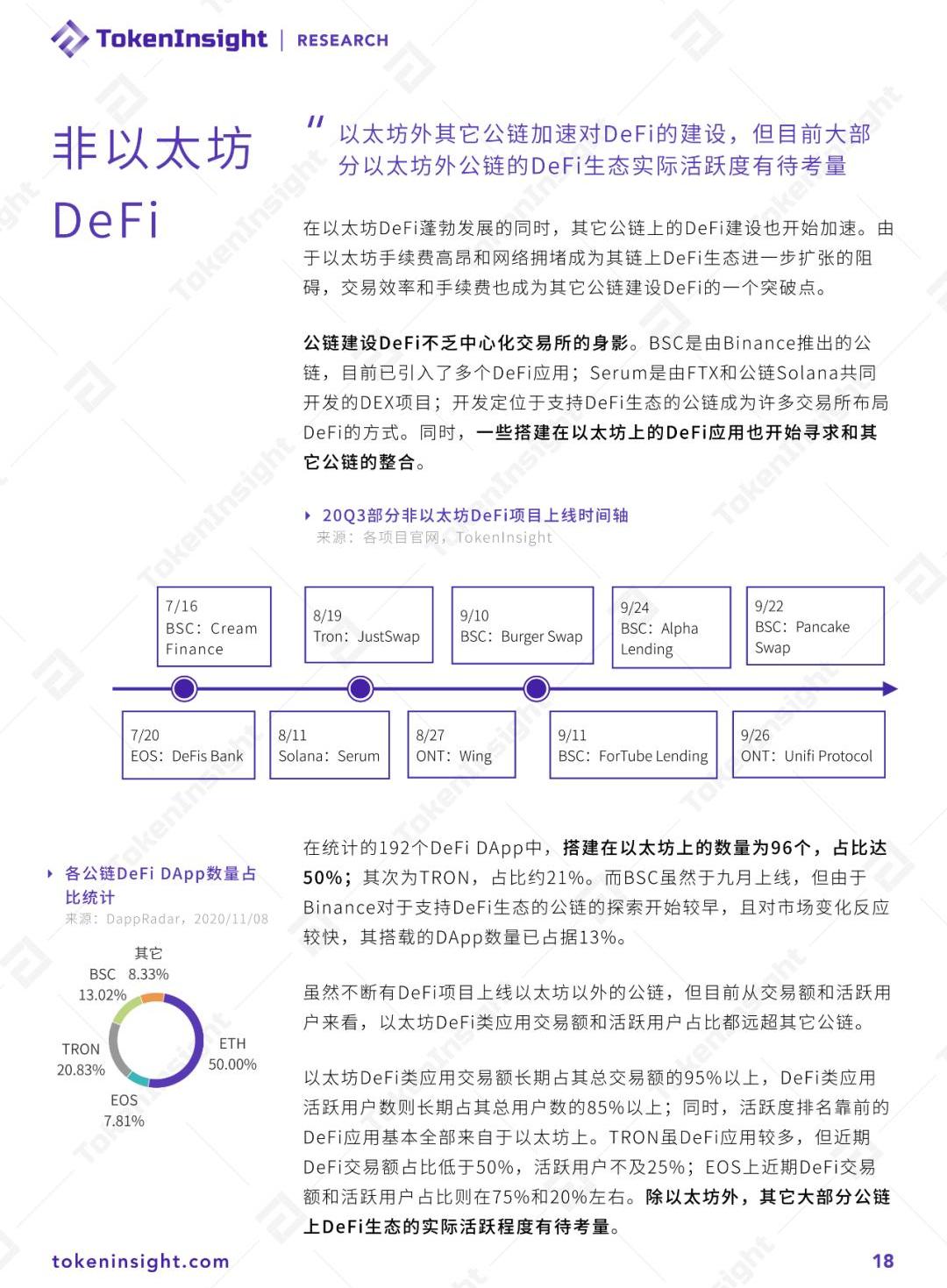 1.借貸領域季度末鎖倉值較季度初增長294%,清算額為二季度的10倍;2.九月下旬起MakerDAO表現強勢,重回鎖倉值榜首,借貸壟斷程度低于DEX,且整體行業已能夠產生較為穩定的現金流;3.第三季度以太坊上去中心化穩定幣發行量占比上升4.18%,DAI的發行量上漲527%,發行量在10月底達9億美元;4.DAI、USDT、USDC為DeFi中未償還債務最高的資產;5.WBTC鎖倉量可以頭部DEX和借貸項目媲美,九十月份鎖倉值變化遠優于DeFi整體水平;6.聚合器yearn.finance第三季度鎖倉值翻97倍,YFI價格上線僅兩周價格超過比特幣,成為最貴的數字資產;7.預言機維持“一超多強”競爭格局,DeFi發展直接影響預言機使用量;8.資產管理類項目收到流動性挖礦和收益聚合器項目崛起的沖擊,資管協議鎖倉值占比持續下降;9.其它公鏈積極建設DeFi,但以太坊DeFi生態仍舊占據絕對優勢。