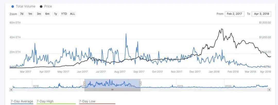 鏈上交易量反應的是以太坊網絡中每日產生的交易量,用于衡量網絡的活躍程度。從上述數據看,在長達兩年的時間里,從2018年5月份至2020年3月份左右,以太坊的日交易量往往在300萬ETH的范圍內波動。
