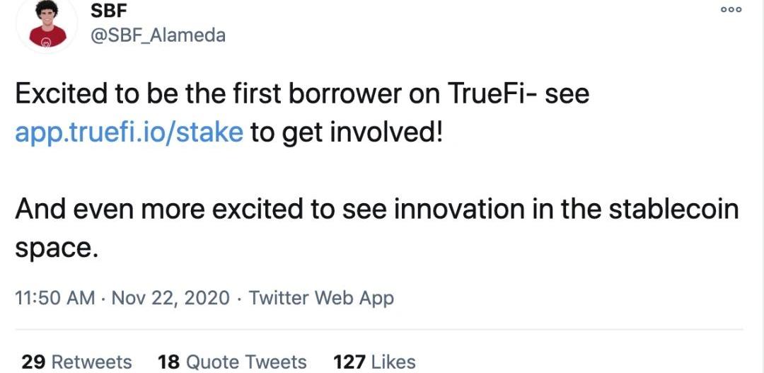 FTX的創始人SBF也轉發了TrueFi項目,表示很激動。