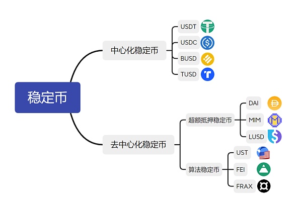 中心化 VS 去中心化:根據發行主體的不同,穩定幣可以先被分為中心化穩定幣和去中心化穩定幣。USDT、USDC 等是中心化穩定幣的代表,由 Tether、Circle 兩家中心化機構發行并運營。中心化穩定幣背后的基礎仍是法幣。由去中心化實體(比如 MakerDAO 發行的 DAI)或某種方式(算法機制)發行的穩定幣則是去中心化穩定幣。