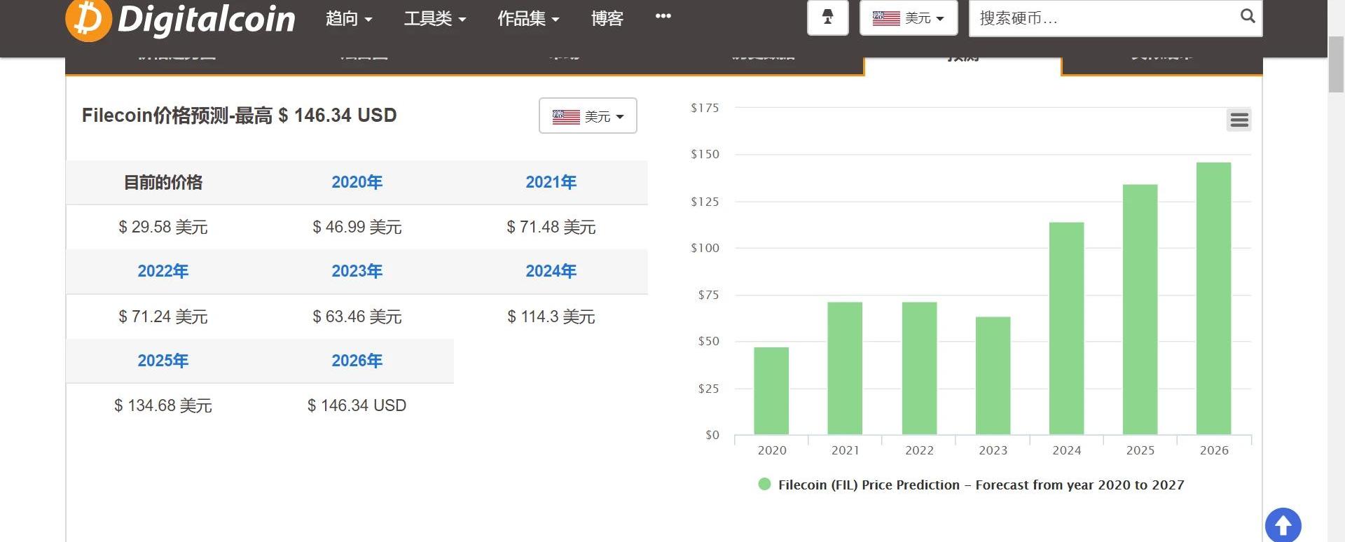 那么接下來進入大家期待已久的部分——Filecoin未來價格預測,以便大家對Filecoin的挖掘和未來價格有更清楚的認識。1.Walletinvestor.comWalletinvestor.com是一個在國外非常受歡迎的網站,它對各種加密貨幣、股票、外匯、房地產等進行基于技術分析的價格預測。根據他們的Filecoin價格預測,FIL的價格將在2020年底達到49.28美元,在2025年達到142.70美元。