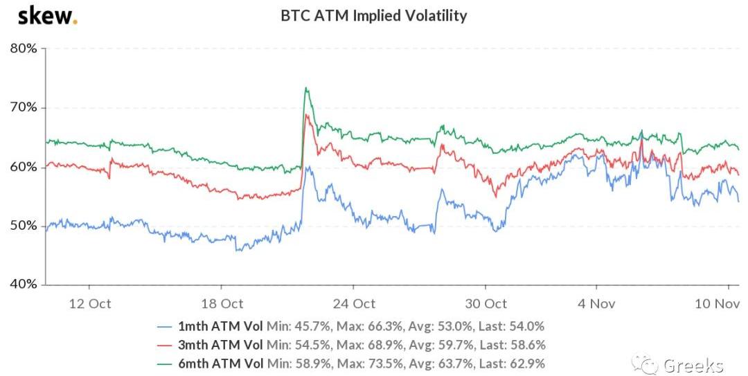 BTC歷史波動率10d75%30d56%90d50%1Y78%期權持倉量26億美元,期權成交量4.21億美元。近幾日日均震蕩超過1000美元,RV維持在75%以上。各標準化期限隱含波動率:今日:1m54.4%,3m68.2%,6m62.6%11/9:1m55.0%,3m60.3%,6m63.4%前期高點:1m65%,3m70%,6m74%