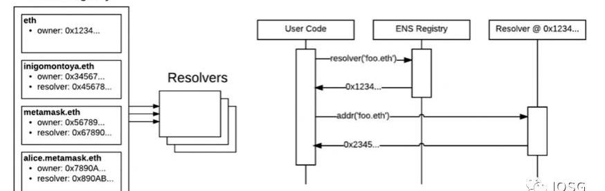 #ENSENS是一個基于以太坊的分布式,開放,可拓展的域名命名系統。其任務是將人類可以讀懂域名,(如:steven.eth)。ENS所希望達成的目標與Web2.0的DNS相似,但是由于以太坊公鏈的能力及限制,使得ENS在架構上與DNS及其不同。ENS架構主要包括兩個組件:注冊表和解析器。ENS的注冊表是一個智能合約,該合約維護所有域名和子域名列表,并存儲關于每個域名的三個關鍵信息:域名的所有者;域名的解析器;域名下所有記錄的緩存存活時間。ENS注冊表非常簡單,其職責是將域名映射到負責解析這個域名的解析器。解析器負責將域名轉換為地址。