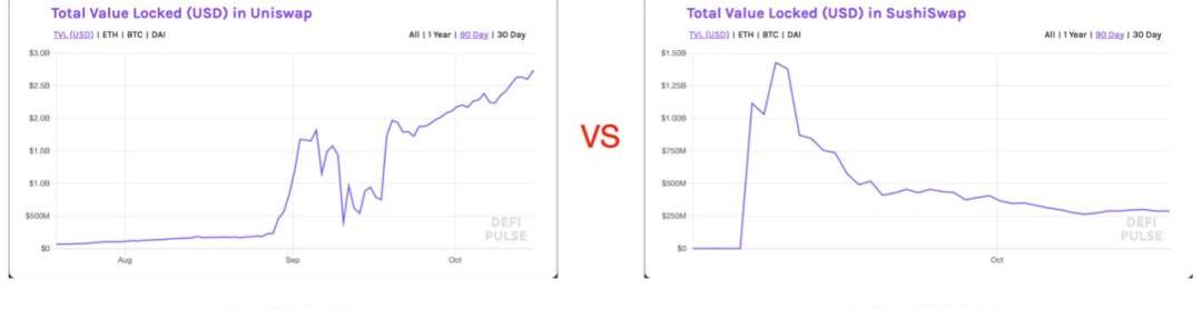 DeFi創造了很多新的概念,也帶來了很對關于如何優化AMM機制,是否引入預言機來幫助解決無常損失等問題的探討與實踐。這里并不對這些做過多討論,因為目前DeFi最核心的業務還是ETH、USDC、DAI、WBTC等流動性相對充足的幣種上,未來更重要的也是引入流動性相對充足的優質資產來增加真實的借貸、交易場景,從而使生態更加健壯。這里要聊的,是關于社區忠誠度、治理及UserCapital相關的話題。社區忠誠度:SushiSwap真的搶了Uniswap的用戶嗎?