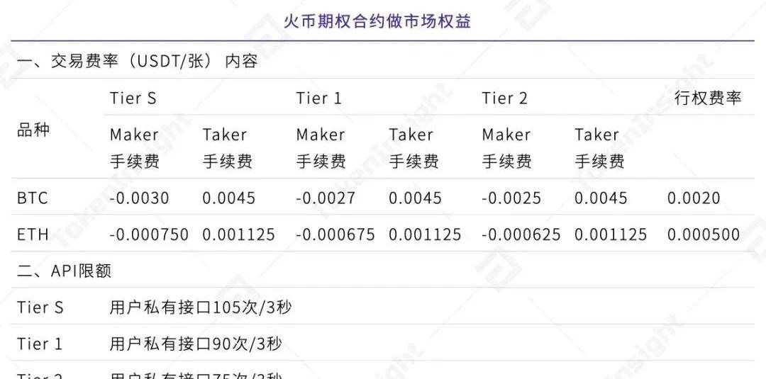 Huobi做市商計劃細則,來源:HuobiFutures3.3.8手續費具備相對優勢為Huobi的交易費用也是一個亮點,Huobi選取的方式是按單張合約收取固定價格的手續費用,一方面,由于單張期權的手續費固定,在交易權利金較高的期權合約時,手續費會有不小的優勢。另外每筆交易的手續費有上限,不超過支付或收取的權利金的12.5%。看漲期權交割手續費為對應的幣種,采用計價幣種USDT估算,并用交割價折算為對應幣種數量,從交割收益中扣除,若投資者的交割收益為負,則不收取。相對于其他交易所,Huobi的虛值期權和平值期權到期自動失效,無需行權交割手續費,只收取實值期權買方交割手續費,而賣方則無需支付行權交割手續費。