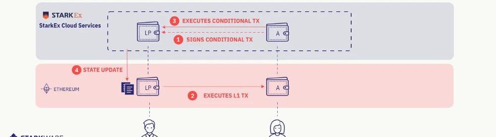 -圖1:快速取款流程-流程:用戶向LP傳遞一筆條件性交易,承諾支付1eth,條件是LP在L1上把1eth打給Alice的L1地址;等LP在L1上給Alice打錢之后,該筆條件性交易生效;LP把該筆條件性交易發送給運營者,等待它被打包到下一批待證明的交易中;等下一筆證明被提交到L1并得到驗證之后,該LP的L2余額增加,反映他從Alice處得到的資金。定期再平衡:該LP需要定期拿自己在L2賬戶中的資金來補充自己L1賬戶中的資金。PhaseII:StarkEx(L2)→StarkEx(L2)