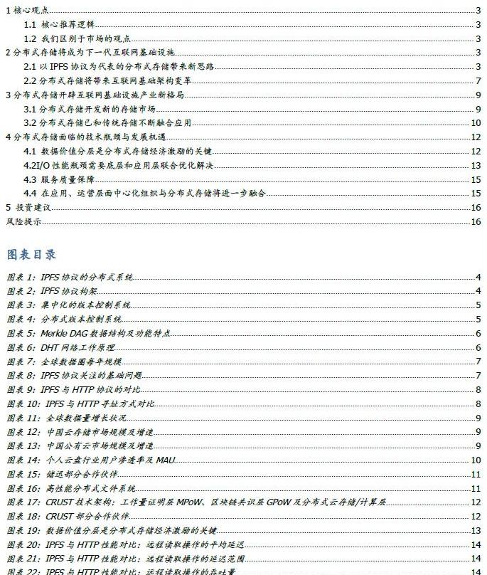 感謝分布式資本提供研究支持,以及儲迅信息技術、CrustNetwork等代表性企業的交流分享。基于分布式存儲的前景:分布式存儲為互聯網基礎構架和商業模式帶來的變革與創新空間,將開辟新的存儲應用市場。分布式存儲采用不同于傳統中心化存儲的資源和市場激勵方式,可以解決中心化互聯網架構下安全性、時效性及成本問題,將帶來互聯網基礎架構變革。另一方面,分布式存儲為個人節點加入市場交換創造了基礎,可以深度挖掘數據內容價值,開辟全新的存儲空間和應用市場。目前的分布式存儲仍面臨I/O性能問題、數據價值分層、應用服務質量等技術瓶頸,在實際應用中需要引入中心化組織進行彌補。以IPFS協議為代表的分布式存儲系統帶來存儲新思路,將成為下一代互聯網基礎設施。IPFS協議是一種文件存儲和內容分發網絡協議,整合了多種成功的分布式系統與區塊鏈技術,為用戶提供統一的可尋址數據存儲。其本質是一個P2P的分布式存儲系統,人人都可以作為存儲文件的服務器,通過基于文件內容生成的唯一編碼去訪問網絡中的文件資源。分布式存儲系統可以與去中心化的區塊鏈技術相結合,解決中心化互聯網架構下數據存儲的安全性、用戶協作的時效性和存儲與帶寬成本的問題,將帶來互聯網基礎架構的變革。分布式存儲將充分激發個人存儲資源和內容貢獻的市場價值,創新互聯網商業模式。全球數據量的爆發式增長推動云存儲市場的快速發展,邊緣云計算和小型數據中心成為行業趨勢,分布式存儲有望率先打開個人云存儲市場空間。個人可以將閑置的存儲資源投入到分布式存儲系統進行市場交換,可以在互聯網上安全地進行內容發布、交換和價值共享,分布式存儲就這樣推動著個人存儲資源市場的資源配置,而這在傳統互聯網巨頭控制中心云模式下是無法實現的。分布式存儲已和傳統存儲不斷融合應用,現有的技術瓶頸需引入中心化組織形式進行彌補。現有的存儲解決方案通常將分布式技術與傳統存儲方案相結合:一方面,對數據進行分布式備份保存,使數據更接近邊緣側,同時避免數據的物理損壞和人為篡改;另一方面,通過一定程度的集中存儲和集中管理來降低系統運維成本,提高服務質量。現有的分布式存儲仍面臨若干技術瓶頸:第一,目前的分布式存儲暫時無法實現數據價值分層,難以實現有效激勵,可以考慮將底層構架和應用層策略相結合;第二,分布式存儲從代碼實現到協議層都有很大的優化空間,還會受到網絡規模限制,存在I/O性能問題;第三,存儲數據價值較高的用戶需要承擔更大的服務質量風險,付費意愿較弱,需要應用層解決方案。總之,考慮到系統運維成本、服務質量和宏觀監管等問題,未來的分布式存儲系統需要引入中心化組織形式來彌補運營成本。投資建議:目前A股上市企業中,涉及存儲類的標的將長期受益于分布式存儲帶來的變革,包括兆易創新、北京君正、同有科技、朗科科技、紫光國微、長江存儲等,具體內容請參考個股深度。風險提示:分布式存儲商業模式落地不及預期;分布式存儲技術發展不達預期。
