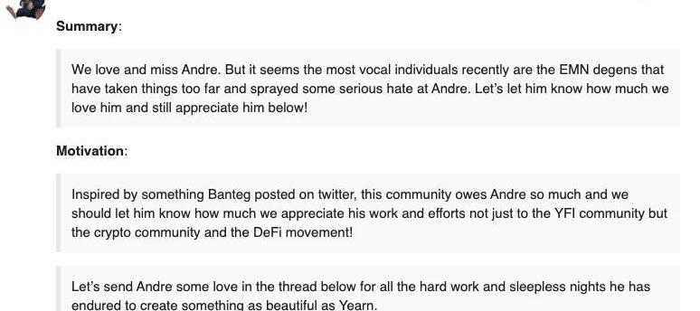 在YFI官方討論論壇上,社區成員@Niffler發起了一個主題為「LoveLettersforAndre」的討論帖,呼吁社區向AndreCronje本人傳遞善意。Niffler在帖中表示,之所以發起這一討論,是因為社區虧欠AndreCronje太多了,人們應該告訴他,大家是多么欣賞他的工作。截至今日13:30,該討論帖已獲得了30個贊,多位社區成員已在討論帖下方表達了對AndreCronje的支持:社區成員@DegenTec:“我認為Andre是這個行業里最聰明的人之一。我認為自己算是一個旁觀者,Andre清晰的頭腦和卓越的建設能力令人印象深刻。即使Andre再也不會出現了,我也很感激迄今為止他所啟發、創造的一切。社區成員@yfi-lit:“Andre就是DeFi行業里的馬斯克。馬斯克都炸了3枚火箭,Andre還有兩次犯錯機會。沒有風險,就沒有回報,我們不該讓偉大的創新者產生恐懼。”社區成員@shivastrikes:“你好,Andre。我打一開始就一直在關注你的故事和YFI項目。你真的很聰明,我很敬佩你的領導能力。我想我們都很期待看到你回歸,不要擔心那些討厭你的人——輸不起的人不值得被聆聽。如果人們不能接受現實,那是他們的問題,不是你的問題。希望你一切都好,并找到一些精神慰藉。祝你一切順利。”「退圈」傳聞并非首次事實上,早在今年8月,情緒不穩定的AndreCronje就曾被傳即將離開DeFi行業。8月8日,海外加密貨幣媒體Decrypt曾報道稱,AndreCronje即將離開DeFi行業,因自己現已“疲憊不堪、破產、瀕臨退出”。但AndreCronje本人隨后回應表示,Decrypt的報道確實有一些真實的部分,但也有夸大其辭、博取關注的嫌疑,自己當前遇到的這些問題都不會構成阻礙,其也將繼續留在DeFi領域進行建設,除非沒有任何東西可以開發了。當時,Aave創始人StaniKulechov曾評論稱:“Andre喜歡建設,他總會回來的。我從這個男人身上學到了很多東西,如果沒有他,行業要怎么辦?”截至發文,AndreCronje的個人推特仍未更新,但或許如Stani所說,這個男人總會回來的。