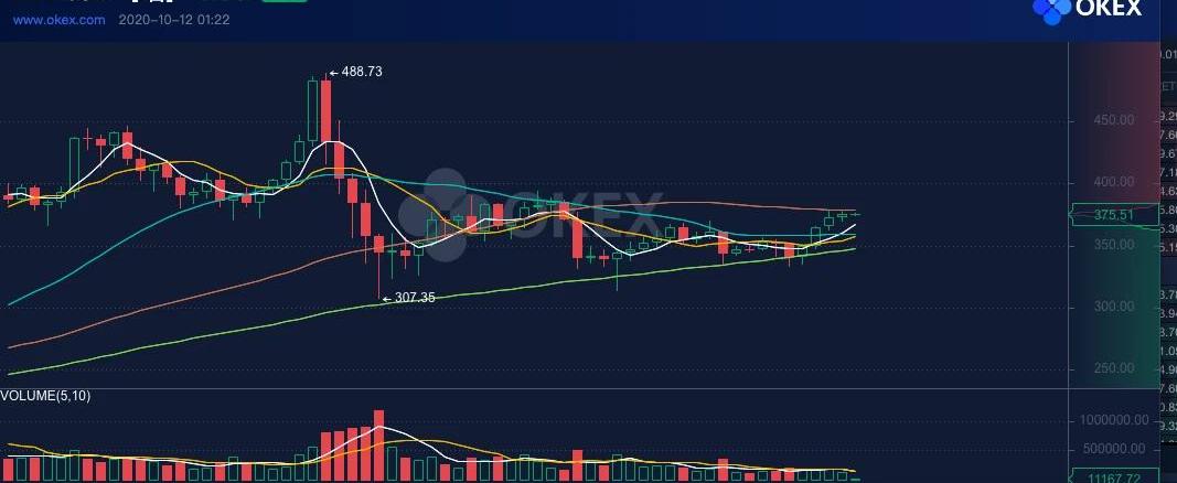 1.現貨市場OKEx行情數據顯示,上周ETH價格一度跌至330美元附近,而后反彈,周內收于375美元,一周上漲8.15%。