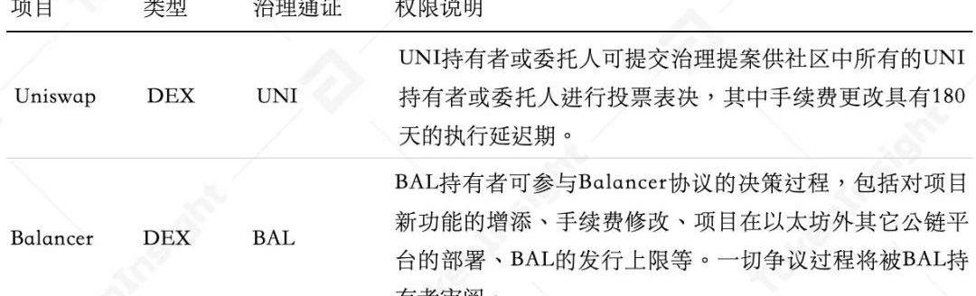 DeFi治理通證發行時間線;來源:TokenInsight治理通證的分配在一定程度上將項目治理權移交給參與者,弱化了核心開發團隊對網絡的控制權。參與者可通過持有通證或接受委托擁有管理項目的權限,而根據項目的不同,每種治理通證的權限執行規則也不盡相同。下表選取了幾個典型的DeFi項目,對其治理通證的權限進行說明。