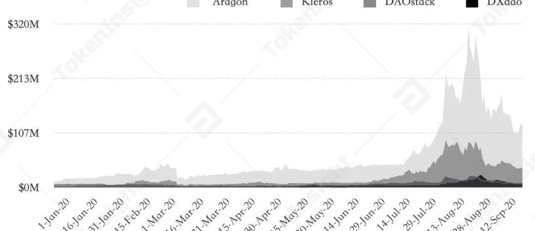 DeFi治理通證分布;來源:Etherscan,TokenInsight,2020.09.28然而,治理通證模式只是在通往理想化的DAO的路上邁出了一步,相比由指定基金會管理等模式提高了去中心化程度,但也仍然存在爭議。首先,治理通證的關注點主要聚焦在鏈上決策權以及協議本身將被如何執行,并不能覆蓋對項目所有狀態的修改,如核心團隊成員的人事任命等。其次,許多項目仍然使用著管理密鑰。雖然管理密鑰的存在是以在特殊和極端情況下保護用戶的利益為初衷,但管理密鑰能夠對協議的諸多內容進行修改,因此引發了安全性質疑。此外,部分項目的核心團隊成員掌握著大量治理通證,且能將通證的表決權委托第三方。用戶治理通證提案和表決權的實際使用程度也因項目而異,市場上許多“挖礦”行為的最終目的主要是將治理通證在二級市場拋售。不包括未被標記的地址就DAO本身而言,其去中心化的屬性,也使得決策過程比起中心化決策更加低效。DAO在一些場景下是否是一種真實需要受到質疑,比方多數處在發展早期的項目仍然選擇以核心開發團隊或基金會來實行決策過程和執行決策結果。但同時,在TheDAO事件之后,業內也不斷有諸如Aragon、DAOstack、Colony、Kleros等DAO項目被發起。這類項目普遍搭建于以太坊之上,定位于提供DAO基礎設施和建設工具,隨著DeFi治理通證的發行而迎來應用需求的增長。2.DAO基礎設施和工具