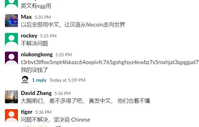 綠頭韭菜也算是中國幣圈特有的“文化符號”了。有意思的是,今日在Filecoin的Slack官方頻道,中國礦工再次用中文作了一次反向文化輸出。Filecoin是海外項目,全球參與,在平時大家都用英語交流,從代碼探討到機制,一片祥和友愛。但在今天下午5點半左右,Filecoin的Slack頻道上,出現了礦工“怒刷中文“抗議官方之勢。“都百度翻譯過來的,還翻譯個啥?”“英文有egg用,以后全部用中文。”“讓漢語從Filecoin走向世界。”