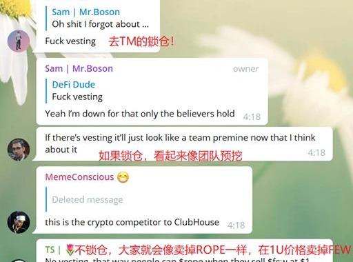 大佬們需要新MEME也許是Defi涼了,也許是NFT太熱。MEME下跌30%之后,大佬需要新的項目來“做實驗”。因為大佬表示:“自己也錯過了MEME。”腿特大VSam、DefiDude聯合Alex、Anthony等大佬,想出新的“實驗”——FEW:第一步,找另外幾個人來,50個人;第二步,先給TG群內50人空投;第三步,喊單。但他們萬萬沒想到,TG群出了“內奸”,大佬的聊天記錄流出。