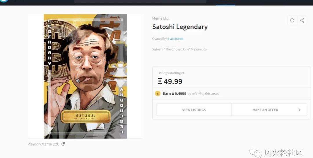 其中第一條紅線birthof說明有人拿挖到的菠蘿幣兌換了卡片,下面一條記錄則是有人將趙長鵬的那張卡片以0.85eth的價格賣出,這張卡片是rare級別挖礦是需要30個菠蘿兌換,有興趣的可以算下這個收益率。目前在最高稀缺級別中,中本聰卡片(需要75個菠蘿全網只產10枚)還只挖出了三枚,所有者給出的報價是49.99ETH: