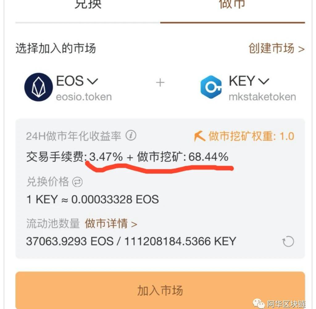 隨著做市資金池中KEY的數量越來越多,做市的年化收益率也在下降,據大豐收的數據統計顯示,目前的年化收益大概在40%左右,比鎖倉點贊的年化收益確實也高不了多少,但這只是單純的EOS+KEY的做市年化收益率,目前在大豐收做市挖礦,往往可以順便一起挖其他代幣,也就是所謂的二挖、三挖,甚至是四挖。在大豐收拿EOS+DMD做市的話可以四挖,也就是可以挖DFS、YFC和DBC、DMD,拿EOS+DFS做市的話,目前可以三挖,即可以挖DFS、YFC和DBC。而EOS+KEY目前是可以雙挖,即除了挖DFS外還可以挖YFC。