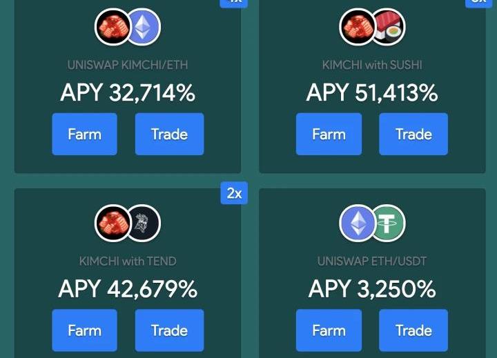有意思的是,KIMCHI的farm僅選擇了YFI、BAND、ETH這三個較為主流的代幣,其外還暗自夾帶私貨,不僅調高了KIMCHI代幣的收益百分比,還有一個并不流行的TEND代幣也進入代幣池,這導致了TEND代幣從1.2美金最高漲至2.7美金,短時間漲幅高達125%。