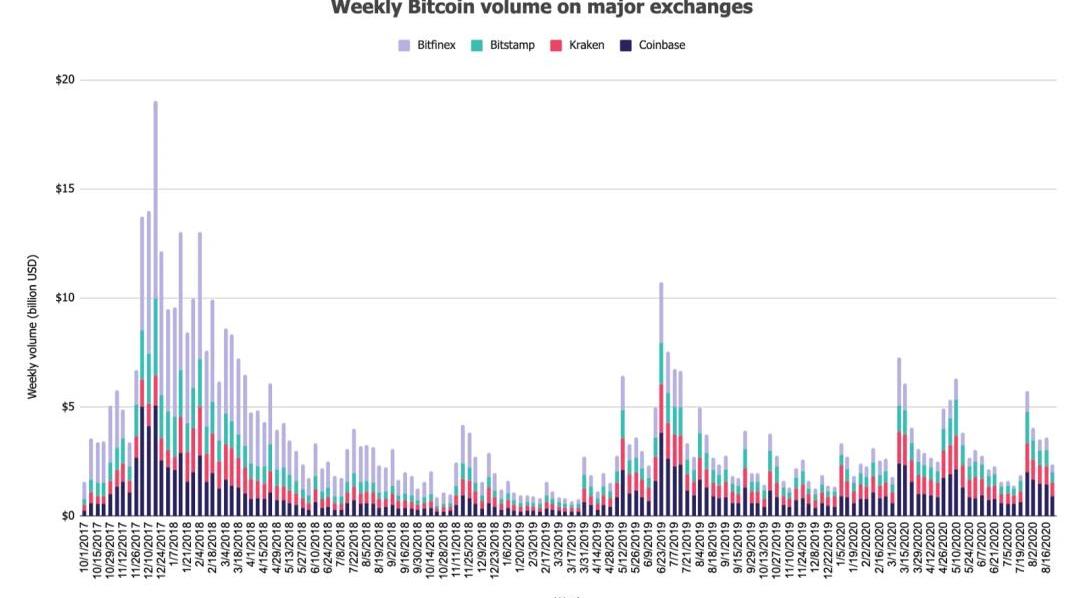 目前中心化交易所的比特幣交易量比2017年高峰期下降了3倍多。