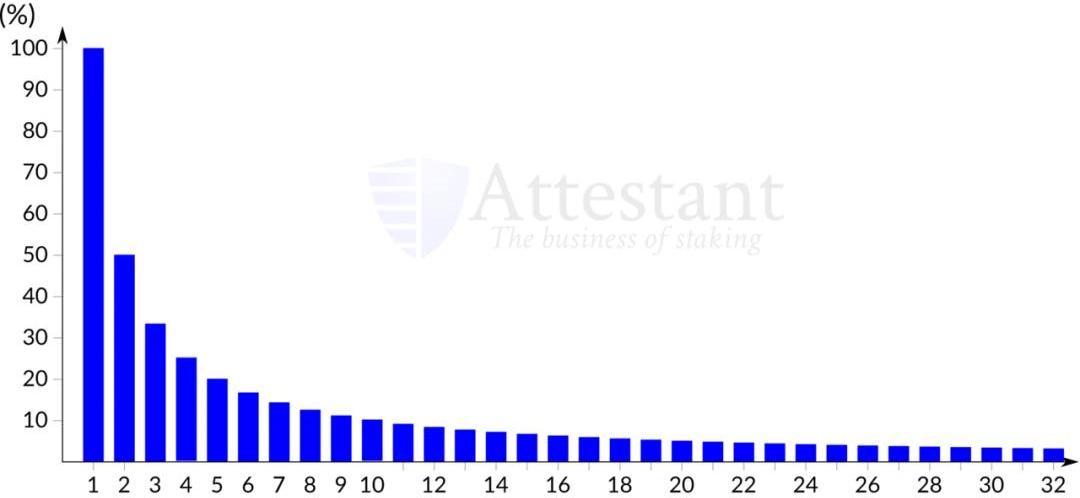 -圖3:聚合見證消息的結構-聚合見證消息與單個見證消息存在兩點差異。首先,前者有多個驗證者。其次,聚合簽名是由單個見證消息的簽名合并生成的。聚合見證消息的存儲效率很高,但是會增加通信和計算方面的負擔。如果我們強制要求每個驗證者將所有見證消息聚合起來,那么將每個見證消息傳給每個驗證者所需的通信量很快就會導致網絡過載。同樣地,如果聚合只是可選項,那么驗證者就不會浪費自己的資源這么做。因此,網絡會選擇一組驗證者來負責進行聚合1。出于利益考慮,驗證者會認真履行職責,因為包含較多驗證者的聚合見證消息更有可能被添加到區塊鏈上,驗證者就更有可能獲得獎勵。執行這一聚合過程的驗證者就是聚合者。見證獎勵的變化情況
