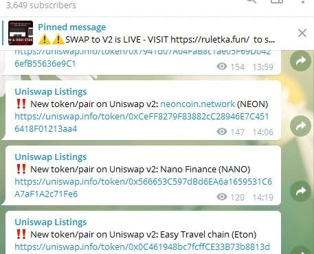 △圖4而根據這些信息,我們可以看出,這個幣種基本可以看作是空氣幣。根據Uniswap的機制,上線一個這種代幣倒可以進行交易,只需要支付生成代幣合約和資金池合約的費用,以目前gas價格,約合50美元,成本極低。而目前上幣情況也幾近瘋狂,根據UniswapListings電報群數據顯示,在不足一天的時間里,已經上線了40個代幣,如下圖所示: