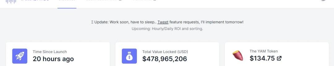 當然這個年化是動態的,隨著抵押資產的上升,年化收益率自然下降。YAM流動性挖礦池子增長非常迅猛,20小時池子里有4.78億美金,就這個鎖倉量已經快趕上Aave,在DeFi中排第5了。再多給他幾天時間,不知道會發生什么。