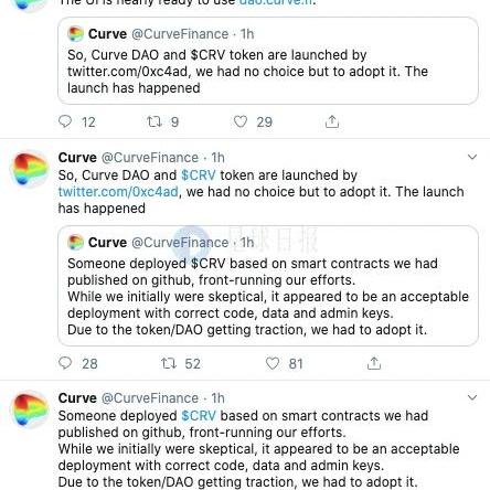 結果是,Curve官方不得不去采用推特用戶0xc4ad的CurveDAO和代幣。看到這里,很多人可能會有所疑問:為什么CRV能被別人提前部署?這部分被提前挖到的CRV可以正常在市場交易嗎?會不會對CRV造成砸盤影響?以及Curve團隊為何不重新部署一個合約地址?PeckShield品牌總監郝天告訴Odaily星球日報,Curve代碼在部署前已經開源,任何人都可以看到,別有用心的參與者也在其中,攻擊者通過觀察項目方部署合約的舉動,比如,Etherscan或全節點交易池之類的,發現項目方做出了部署合約的舉動,攻擊者與此同時也部署了一模一樣的合約,或以更高的gas部署費搶先部署成功了。在項目方發現部署失敗后的時間空檔內,攻擊者已經瘋狂啟動了預挖,自然同時也被項目方發現了,項目方于是開始披露出現的狀況,并和攻擊者協商處理方案。一種處理方案是:項目方和攻擊者協商,要求其交出私鑰,然后銷毀掉預挖的代幣,重新宣布啟動挖礦;另一種則是:項目方重新部署新合約啟動項目,但考慮到項目已有的知名度,這需要一定的其他成本考量。郝天提醒各位投資者,無論如何,目前已經啟動的項目合約,官方還沒有實際控制權,建議用戶務必不要參與,避免資產遭受損失。也有網友認為此事是Curve官方的失職,認為官方沒必要認可一個搶跑的合約。但是目前來看,這件事對官方來說是沒有什么損失的,這提前被挖出的25萬枚CRV只能由之前那些提供流動性的人或者二級市場的買家來買單了。
