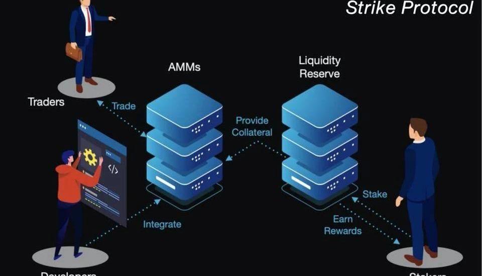 StrikeProtocol是一種去中心化的永續合約交易協議,適用于所有鏈上資產和鏈外資產。Strike主要由兩部分組成:一個類似于Uniswap的AMM和一個內置的流動性儲備池,AMM負責提供鏈上流動性,流動性儲備池則負責支持和保護AMM。交易者可直接與AMM進行交易,無需交易對手;而質押者可以將Strike的平臺幣SKT質押在流動性儲備池中并獲得質押獎勵及部分交易費用,流動性儲備池主要用于彌補意外損失。