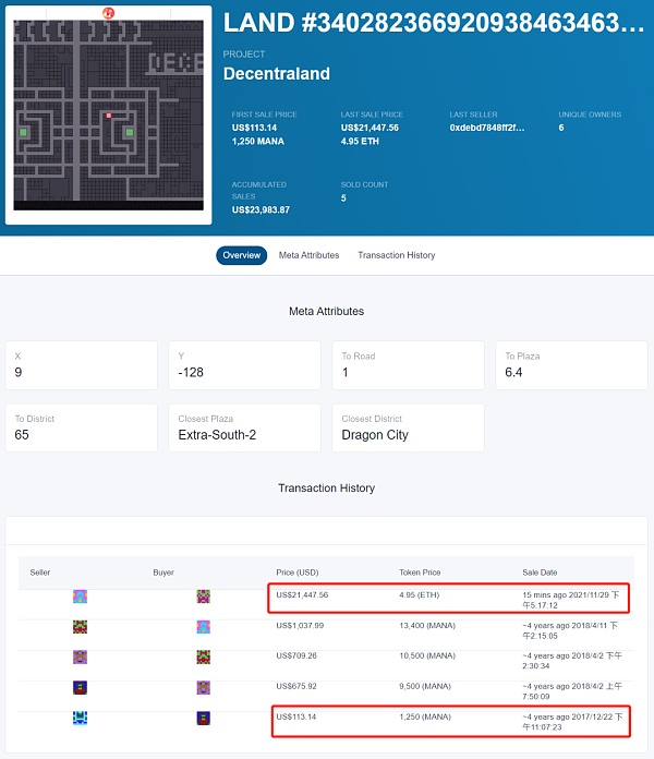 以下圖這個最新成交的LAND作為案例,于今天下午17時17分成交的虛擬土地,成交額為2.1447萬美元,但這宗虛擬土地在2017年末首次出售時僅113美元,中間經過了5次倒賣,價格翻了214倍。