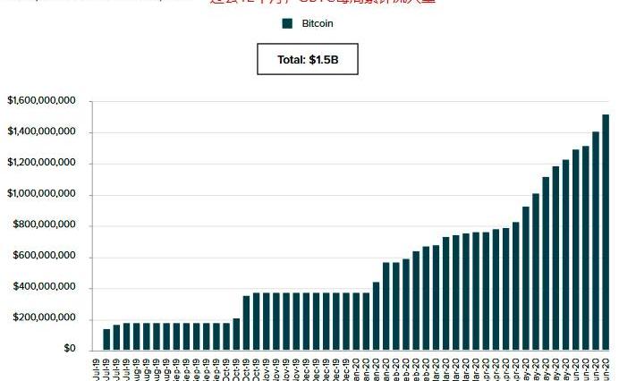 過去12個月,灰度不同投資品每周資金流入量3)2020年Q2,灰度GBTC的資金流入達到了創紀錄的7.511億美元,超過了上一季度3.889億美元的最高水平。這使得過去12個月GBTC資金流入達到15億美元。2020年Q2,GBTC每周累計流入量。