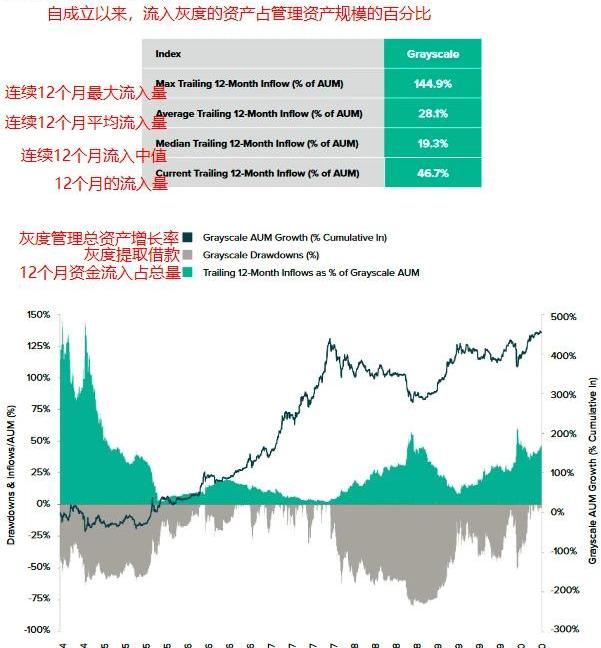 自成立以來灰度各類資產累計流入量圖8顯示了Grayscale系列投資品資金流入占資產管理規模的百分比。這一指標可作為衡量加密資產可投資性的指標,這可能對未來的價格走勢有重要影響。投資者認為,大量資本流入的結果就是價格必然飆漲。盡管過去的表現不能作為預測未來的標準,但從歷史上看,在牛市到來之前,以美元計價的資金流入灰度管理基金的將會大幅增加。雖然觀測的案例是有限的,且很可能有所偏差,但是通過過往數據預測未來,總是十分有意思的。