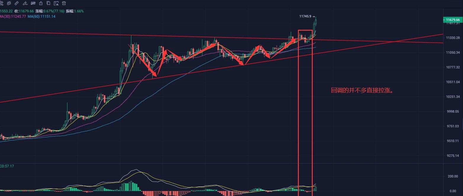 XRP/HKD-1.66%昨晚比特幣再次刷新近期新高后,本周的行情基本上是穩了,距離上一個高點10500將近1000美元的差距,周末剩下的時間大概率翻不了船。本周若是穩了,那整體大方向便不會輕易改變,接下來要面對的是便是小伙伴們和行情本身的斗爭,在上漲趨勢中,若是多頭籌碼太多的話,便會被莊家大戶反復折騰洗盤,只有這樣,莊家大戶分到的利益才會更多。在牛市中,虧錢的投資者更多是真實的情況,最簡單的原因是,熊市行情萎靡,關注的投資者相對而言不多,而牛市中市場情緒被調動起來,和莊家斗、和自己的貪欲斗、和自己的執行力斗,每一個坎都是阻擾我們賺錢的因素,全部闖過來的人才能賺錢,我們在市場上見過無數人一開始說牛市閉著眼睛都能賺錢、認為自己比他人聰明,可最后還是兩手空空,成為別人登頂的墊腳石。當然我們這樣說了,也不意味著宣告接下來馬上就是大牛市,我們說過,牛市只有走出來了才是牛市,走出來之前就只是趨勢而已,所以現在就只是跟著趨勢走,趨勢能持續到底才是牛市。正所謂,兵貴神速,在市場中不可能時時刻刻有人提醒你該怎么做。我們今天只討論有可能是牛市的情況,在真正的牛市中應該怎么做才能提高自己盈利的概率。1、更多的持有現貨。在牛市中現貨的收益率是最高的,對期貨而言1000點美元的上漲都能算是牛市,在單邊上漲中反而不好掌握,大多玩合約的人都不會長久的持有單子,開個高倍,搶到一段就跑,交易頻率又高,犯錯的概率就加大,算你一般投資者70%的勝率好了,30%是虧錢的,抵掉30%的勝率,凈勝率是40%,在這40%中你要扣除交易費、手續費等雜七雜八的費用,剩下的還能有多少?而且,數量只會降低質量,即交易次數變多的話40%的凈勝率不也能賺更多嗎?但是無論是什么情況下,交易頻率變多,勝率只會下降,而且基本上沒有交易員是通過提高交易次數來積累盈利的。對于現貨,便要簡單的買進,低位持有的話,只要將損失控制在自己的成本之上,甚至可以當做將錢存在銀行里拿利息,盈利的話,將止損位往上移那么一兩個百分點,當做是利息,最后即使止損了,但最后上移止損位的位置,基本上遠大于放在其他投資市場的收益。當然也存在著現實情況,合約的成本更低,現貨的成本比較高,一般人難以承受,但成本少并不意味著要開高倍數,更多的還是心態問題。富人靠財富制造財富,窮人夢想著一本萬利,巴菲特最令人佩服的是這么多年以來的穩定收益,隨著時間累積的復利讓他成為了“投資皇帝”。2、不要一梭子打掉所有子彈梭哈是大部分投資者的通病,所以我們經常可以看到無論是在主流幣種還是其他山寨幣中,經常有小伙伴長時間被套,一旦被套牢了,好的情況套一段時間還能回本,慘一些的基本上是項目方直接跑路,血本無歸,最后到處維權。最好的做法是關注主流幣,并且分散投資,即使沒有經歷多關注幾個主流幣,只投資比特幣也行,但也不必在一個位置就投入全部的籌碼,學會如何分批加倉也是交易時很重要的步驟。一些比較經典的加倉方式如金字塔加倉法、倒金字塔加倉法以及贏錢加倉法,都值得大家去學習,尋找一種最適合自己的加倉方式,足以為我們在交易市場中取得更大的盈利概率。3、不要頻繁更換標的這一點也是大部分小伙伴會遇到的陷阱,本質上是由于缺少耐心導致,具體分為兩點:一是自己看好的幣漲了,但是自己沒有上車,便會開始焦急,以至于匆匆忙忙就買進,買進了以后又陷入回調,看到別的幣上漲了,便匆忙更換標的,一圈下來,損失慘重,被行情帶著走。二是自己買的幣沒漲,但別的幣漲了,前期或許可以忍受,但就在別的幣種處于上漲末尾自己手中的幣上漲前夕時,匆忙更換標的,又打亂了自己的節奏。這兩種情況是很多小伙伴在牛市中虧錢的重要因素之一,自己買的幣沒漲別人的幣一直漲和自己買了他不漲不買馬上漲,也是幣市中很多小伙伴的切實感受,但遇到這種情況的投資者,有沒有想過,別人上漲的幣是不是也經歷了難熬的等待時光才有了現在的爆發,只看到他人收獲的時刻,卻忽略他人收獲前經歷的痛苦時光。在真正的牛市中,有一個最簡單的方法,就是其他幣漲了若是由于或者不放心的話,可以去找還沒漲的、有價值的主流幣埋伏,只要這個主流幣有價值,有用戶,在這輪牛市中能存活下來,總會出現報復性的上漲,因為主流幣種體量更小,概念更新,更容易吸引牛市的跟風和增量資金,當比特幣或者說價格貴的幣種拉盤往往需要更大的資金量,所以很多投資者會將目光放到容易拉漲的幣種上。總而言之,當牛市來臨的時候,保持更理性的思考尤為重要,在這個時期,市場的氣氛更容易影響到自己的判斷,若是判斷錯誤不及時改正,損失的同時,還白白浪費了等待這么久的牛市。上一次牛市比特幣上漲了140倍,還是虧錢的人更多,說明牛市中將能賺錢和不賺錢的人分化的更明顯,牛市中行情基本上沒有問題,更能體現的是交易者的本質。回到行情上,今天白天強勢拉漲,目前還在持續上漲中,已經從11200美元附近拉漲至11750美元附近,現在的上漲已經不只是靠喊了,這就是行情強勢的樣子,任何時候都有可能突然拉升。日線級別我們之前也說過,在本周一一根10%的大陽線出現后,后面幾天有回調就馬上拉上去,整體保持震蕩的格局,已經算是很強勢了,僅震蕩消化了三天,行情再次開始拉漲,本周已經上漲超過17%,預計周末剩下