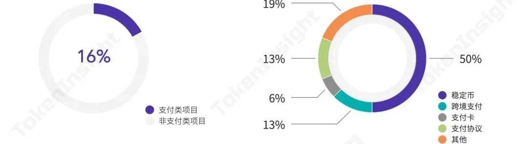 各中心化支付機構對區塊鏈的探索和應用案例,來源:TokenInsight3.2區塊鏈項目概覽區塊鏈支付項目主要采用區塊鏈技術和數字資產對現有的支付效率和安全性進行優化,降低支付成本。在市場上涌現出許多的支付項目中不乏優質項目,據TokenInsight對數字資產市場市值排名前100的項目進行統計,其中支付類項目共計16個。由于目前市場上許多支付類項目業務較為多元,且部分項目仍在發展當中,商業模式和發展重心可能發生改變,行業尚未有明確分類;但根據項目的主要應用場景和最常使用的功能,還是能為項目劃分出幾個領域。由下圖市值前100名的支付項目組成可以看出,在目前發展較為成熟的支付項目中,穩定幣項目占據大多數;跨境支付項目Ripple和Stellar同樣發展較好;支付卡、支付協議和對支付場景進行支持的項目也具備發展空間。