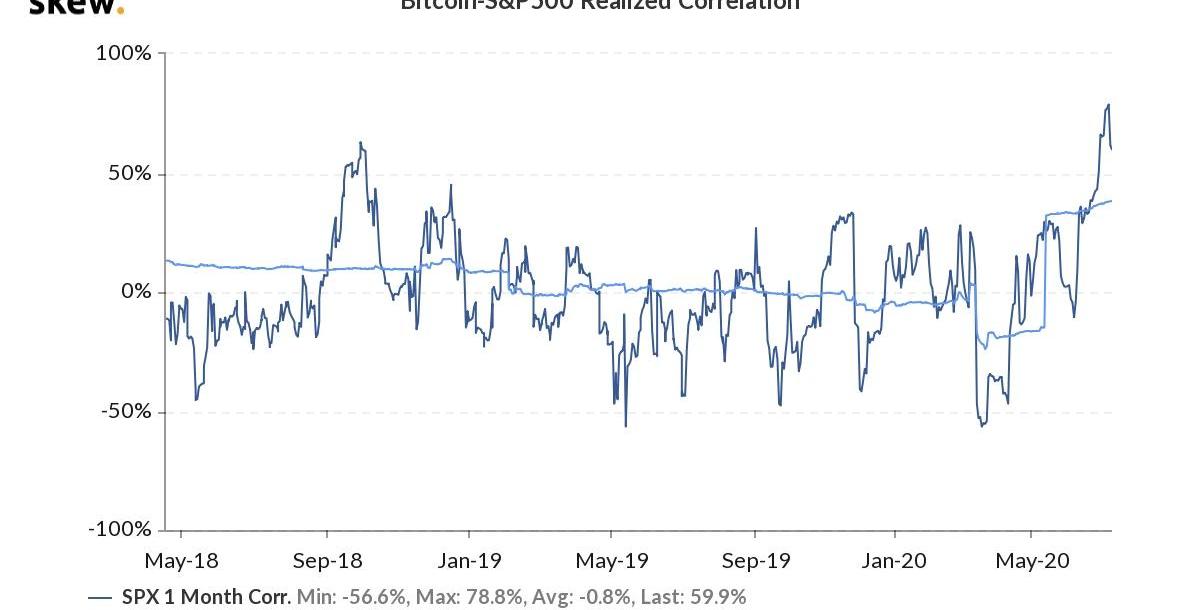 資料來源:Coinmetrics如果我們仔細研究比特幣與股票指數的短期相關性,會發現隨著市場預期和投機水平的上升,這種相關性會更加顯著。根據Skew的數據,一個月的相關性在7月8日見頂,達到了0.788的歷史新高水平。