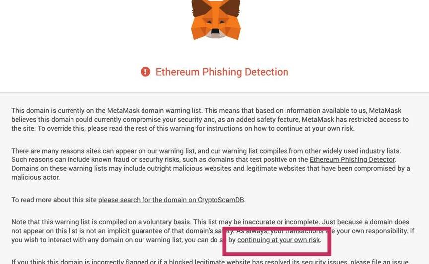 首先打開https://yfii.finance/,如果收到MetaMask的風險提示請直接忽略,因為項目初期名字和原項目YFI較為相似,被MetaMask誤判為釣魚網站,目前已經在申訴流程中,點擊「continueatyourownrisk」繼續。