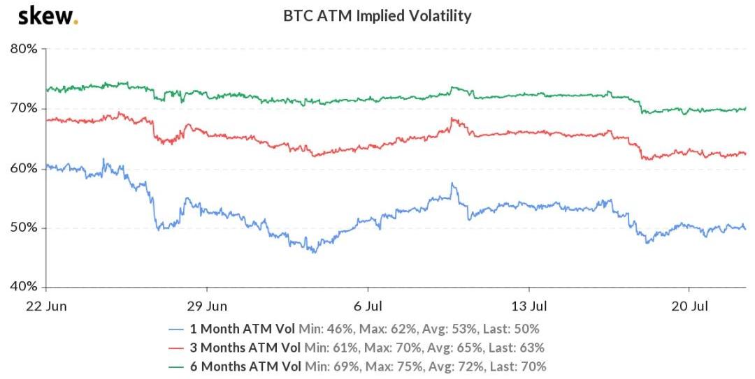 持倉量12億美元。期權持倉量整體比較平穩,平穩的接近6月交割持倉量。各標準化期限隱含波動率:今日:1m49%,3m62%,6m70%7/21:1m50%,3m62%,6m70%隱含波動率幾乎沒有上升,昨日在上漲途中隱含波動率稍稍上升了1到2個百分點,但是很快就又回到平靜了。