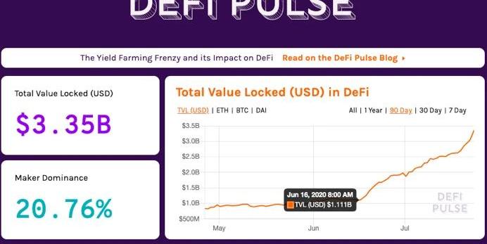 去中心化金融DeFi協議在以太坊上的繁榮無疑是近期ETH的最大利好。DeFi數據平臺DeFiPulse數據顯示,從今年6月中旬開始,以太坊網絡上DeFi協議的鎖倉金額從10億美元上漲到33億美元,一個月翻了3番。