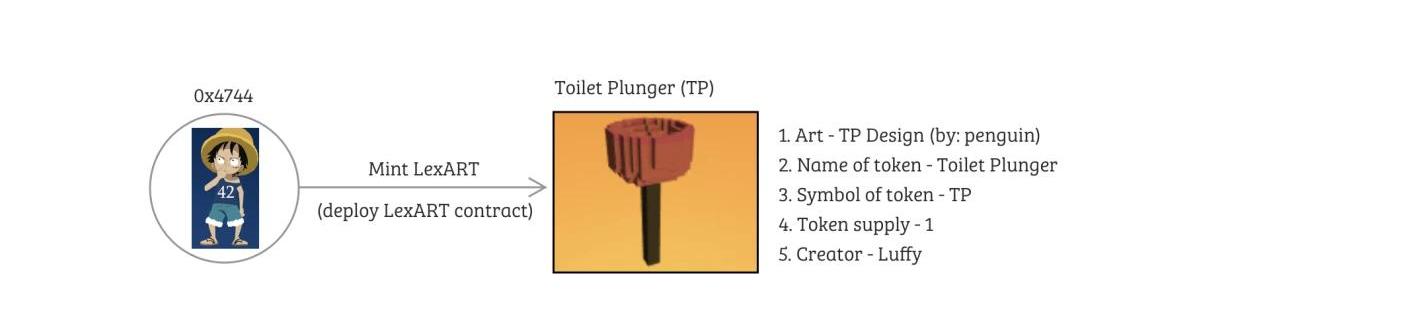 我們從路飛開始,海賊王的主角。路飛是草帽海盜團的船長。他偶然發現了企鵝創造的一些很酷的設計,并決定把它通證化。他通過具有必需名稱、符號等信息的LexART智能合同來鑄造馬桶活塞通證(TP)。TP是唯一的。這是一個ERC20通證,其供應上限為1。路飛最初打算用TP來設計有史以來最好的馬桶活塞來保持海盜船的清潔。他有一個更宏偉的夢想但卻沒有多少時間,所以他決定把它賣給他的船員弗蘭奇。弗蘭奇是鋼鐵俠,但用可樂作為燃料。路飛認為這個設計將有助于發明新的武器。第二步