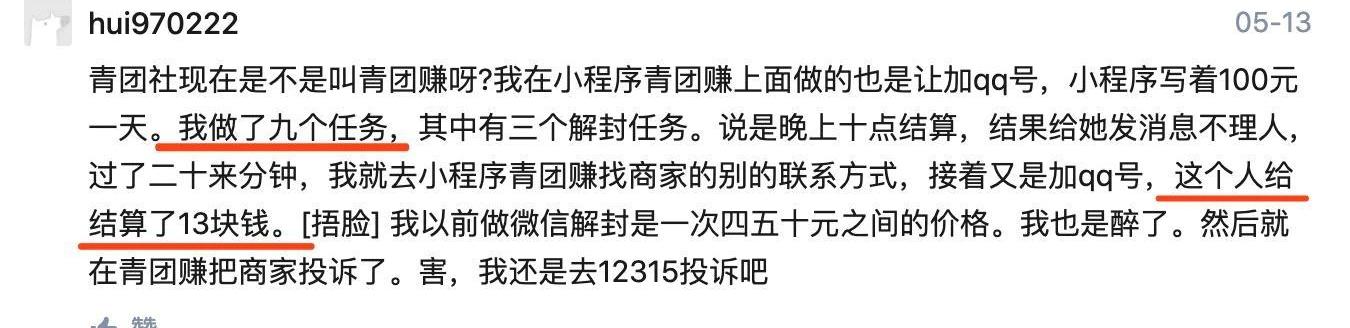 其次,關于薪資,在青團社上這種兼職通常寫著12~20每小時,但是實際結算卻并非如此,而是有另外兩種模式:第一種:只告訴你1~10元一單,不告知具體每一單的價格,然后累計八單或者十單統一結算。網友“查莉一世”就曾經在知乎爆料,自己做這種兼職從下午做到晚上,辛辛苦苦下載認證10個APP,結果最后只拿到12塊錢。除去實名認證支付的1.5元,相當于最后自己就賺了9.5元。。。坑爹得很。