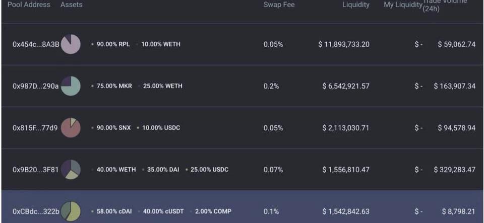 20多歲的時候,我曾短暫地迷戀過都市農業的想法。起初是像布魯克林RedHook農場這樣的社區花園,然后發展到垂直農業,在密集的都市地區有效的利用空間,提供健康的本地生長的食物。養耕共生的概念尤其吸引了我的注意。這套系統將水產養殖與水培結合起來。這兩種活動是共生的,來自水產培育系統的廢物分解后,為水培系統提供養分,凈化后的水再循環到水產培育系統中。將這個過程結合在一起,能為兩者都帶來收益。此外,水培系統為農民提供了兩個收入來源,既增加了潛在收入,又能讓收入多樣化。我想,你能明白我為什么提到這個……放貸協議和交易所協議,特別是利用了池聚流動性和自動做市商的那些協議,本就是共生性的。像Compound和Aave這樣的放貸協議希望有大量的資產存入其流動性池,以最大化貸款的可獲得性,同時最小化借入成本。Uniswap和Balancer這樣的交易所協議,則希望有大量資產存入其流動性池,以使潛在的交易規模和交易額最大化,同時讓滑點最小化——他們并不關心其資金池中的資產是不是貸款抵押品的收據,只要放款池中有足夠的未使用的流動性,可以按需取款。在正常情況下,在放貸協議中,流動性提供者基于資產借貸時間的長短賺取費用;在交易所協議中,流動性提供者基于資產交易額賺取費用。在其他條件相同的情況下,一個流動性池中的兩種或多種資產在可用于放貸時,不太可能獲得一樣的利率,因此,它們在池中的比例自然會偏離其目標。這就為套利者創造了機會,他們可以進入池內交易以讓池子回復平衡,這反過來產生了交易費。于是,在正常情況下,來自放貸的收益會鼓勵來自交易的收益,這又會用于放貸......這是一種美妙、合理、自然的共生關系。但現在不是美妙、合理、自然的時代,而是超級工業、轉基因生物燃料、直升機補貼的瘋狂時代的開端。當這個新的加密農業時代剛剛過去一周,收益培育者就已經如魚得水了。看看下圖,一個流動性最強的Balancer池。