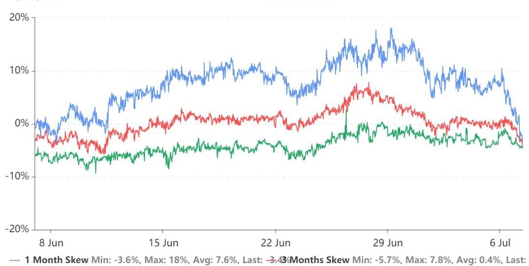 偏度:今日:1m+1.1%,3m+7.7%,6m+6.8%7/6:1m-3.5%,3m+6.1%,6m+7.2%ETH的skew全部回到正值,盤中中短期一度高漲至15%,從成交數據看可能是開倉日歷價差。市場明顯還是對今天的上漲有所反應,看漲情緒開始釋放。