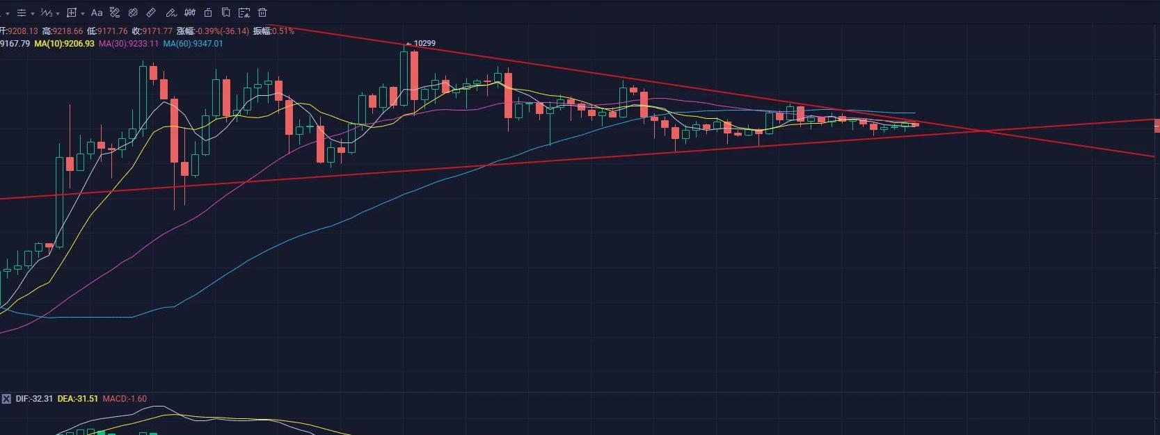 這和比特幣陷入沉寂的時間剛好吻合,二季度灰度大肆購買比特幣之時,市場有不少擔憂的聲音,若是灰度購買比特幣的行為持續下去,是否意味著日后對價格有更強的把控能力?但是當灰度購買比特幣的結果我們也看到了,幣價直接停滯不前,始終處于窄幅波動,連續三周波動的幅度都在500美元以內。因此,當前市場矛盾在哪里?根據比特幣以往的暴漲暴跌我們可以看出,這是個由莊家把控的市場,這一點才是最為外人詬病的地方,在正式接觸這個市場前,誰也不想進入一個被人隨意操控的投資環境。現在問題就在于,若是沒有莊家的參與,根據市場內的自我驅動力量,反而會更停滯不前,這一個月期間,即使灰度沒有再次參與,但其他莊家也在場內。而莊家每一次行動以后我們都能知曉是莊家在行動,我們發現,這300-500美元的波幅上下限,正是由于莊家參與方才達到,莊家消失之時行情的波動范圍僅在100美元左右。莊家活躍時,暴漲暴跌不斷收割韭菜,市場內外的投資者怨聲載道,難改高風險投機市場的印象。而莊家沉寂時,市場行情也陷入沉寂,人氣更是不斷流失。兩杯藥,看起來始終要選一杯。所以這就是當前幣圈的死局,其實吸引人氣很簡單,就是價格不斷的上漲,當前比特幣若是能漲上一萬美金,展現牛市之姿,市場依然會逐步邁向瘋狂之路。而當前漲上一萬美金的動力唯有莊家,一方面是只有莊家才有這樣的資金。另一方面,很多小伙伴的關注點一直放錯了,不是行情暴漲暴跌會吸引人氣,而是行情一直漲才會吸引人氣,無論是17年的大牛市還是19年的小牛,都是如此,所以行情持續上漲=人氣復蘇是幣圈唯一成立的等式。回到行情上,當前行情其實也沒有什么分析的,根據近期波動幅度看,就是處于9000-9300美元之間震蕩,而9000-9300美元還算是一個大的震蕩區間,期間小行情可能只有50-100美元的波動,是典型的風險大于機會。日線上依然是以這個收縮三角區間為主,雖然昨天有一波100美元的探底反彈行情,但上方壓力過重,有均線、關鍵點位以及三角區間上軌多重壓制,暫時進行回測也在意料之中。